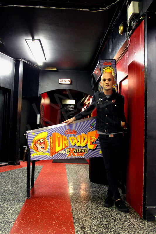 Zach Blair in front of the Dr Dude Pinball machine - Limited Print Run